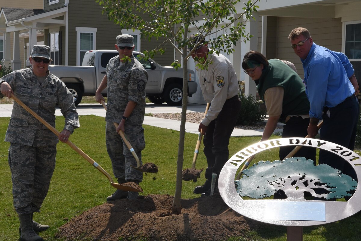 F.E. Warren celebrates Arbor Day Published Sept. 8, 2017 By Terry Higgins 90th Missile Wing Public Affairs F.E. WARREN AIR FORCE BASE, Wyo. -- Arbor Day first began in Nebraska in 1872. It was founded by J. Sterling Morton, who proposed a tree planting holiday. During the first Arbor Day, prizes were awarded to individuals and counties within Nebraska that could properly plant the most amount of trees. It was estimated that, within the state, over a million trees were planted. The tradition was continued on September 7, 2017, by F.E. Warren Air Force Base Homes. During the celebration, several trees were planted by Balfour Beatty Communities within Peacekeeper Heights and speeches were given to promote the importance of trees and plant life within the ecosystem. F.E. Warren is a member of the Tree City USA program offered in conjunction with the Arbor Day Foundation. The initiative is a nationwide movement that provides the framework necessary for communities to manage and expand their public tree system. “2017 is the 145th anniversary of Arbor Day and Francis E. Warren AFB’s 29th consecutive year of participation in the Tree City USA program,” said Lt. Col. Erin Weatherly, 90th Civil Engineering Squadron commander. “Trees, wherever they are planted, are a source of joy and spiritual renewal.” Nationwide there are 3,400 communities that have made the commitment and entered Tree City USA. Programs must meet four core standards of sound forestry management: maintaining a tree board or department, having a community tree ordinance, spending at least $2 per capita on urban forestry and celebrating Arbor Day. “The recognition of the base in the commissioning of the trees planted during this event is a great thing,” said 1st Lt. Allen Sparkman, 90th Civil Engineering Squadron deputy flight chief. “Trees mean so much to the people that live and work on F.E. Warren.”
