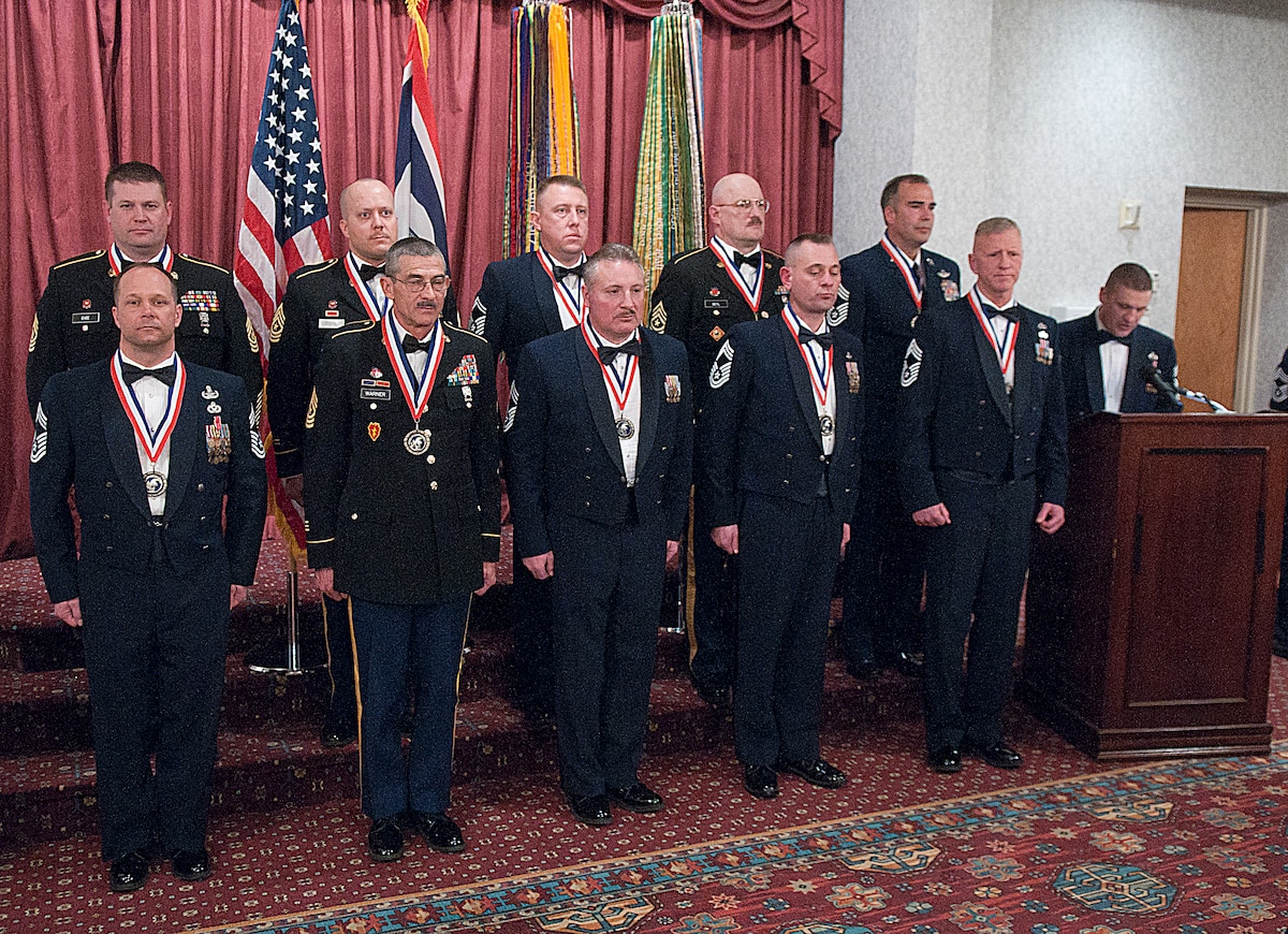 Newly inducted chief master sergeants and sergeants major stand at attention in the Trail’s End Club March 1 as Chief Master Sgt. Michael Garrou, 90th Missile Wing command chief, gives his remarks during the induction ceremony. The induction ceremony paid tribute to those assigned to F. E. Warren Air Force Base, Wyo., the Wyoming Air National Guard and the Wyoming Army National Guard who have been promoted to the rank of E-9. Inductees: Chief Master Sgt. Jack Goeken, 187th Airlift Squadron Chief Master Sgt. Scott Hasert, 153rd Communications Flight Chief Master Sgt. Leroy Rusk, 153rd Civil Engineer Squadron Chief Master Sgt. Gary Underwood, 90th Civil Engineer Squadron Senior Master Sgt. Marc Vogt, 90th Maintenance Group Chief Master Sgt. Bill Whipple, 153rd Maintenance Group Sgt. Maj. Mark Beyl, 115th Fires Brigade Sgt. Maj. Thad Ehde, 94th Troop command Sgt. Maj. James Shreve, Joint Forces Headquarters Sgt. Maj. Michael Warner, Headquarters and Headquarters Battery, 2/300th Field Artillery Battalion (U.S. Air Force photo by R.J. Oriez)