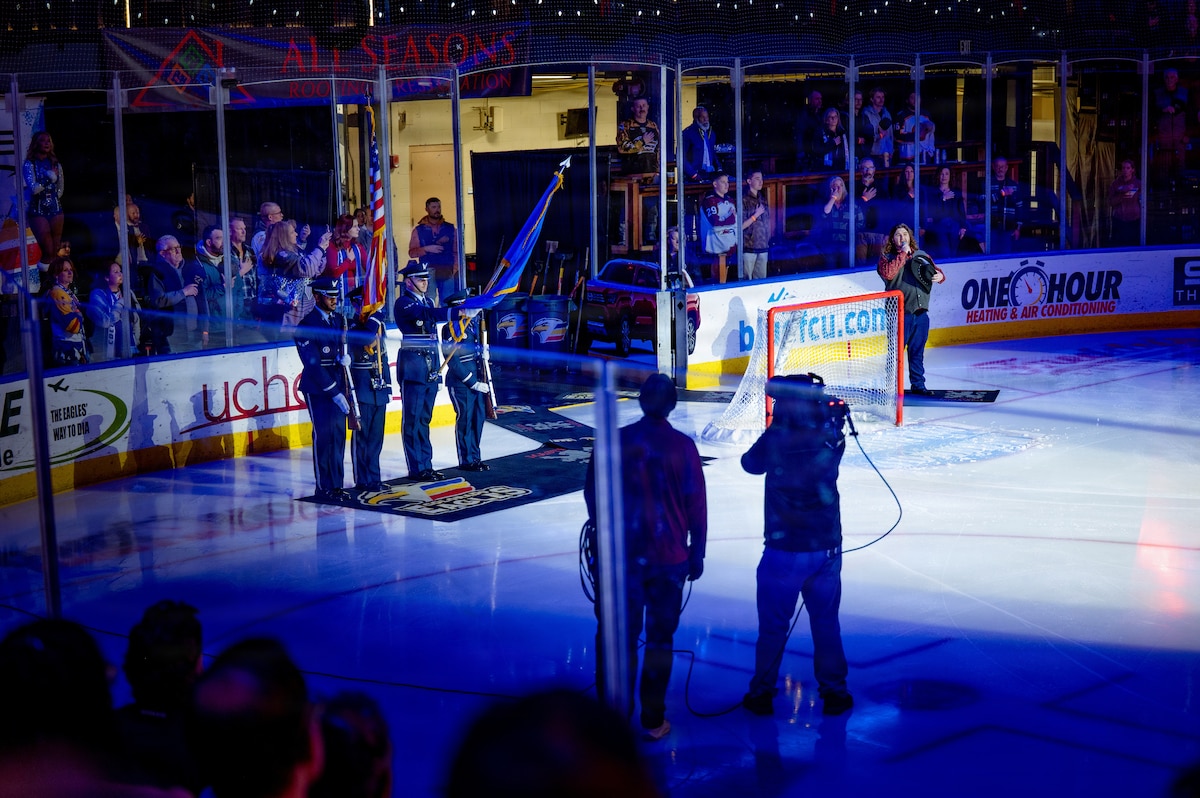 F.E. Warren AFB Honor Guard Performs at a Colorado Eagles Game Published Dec. 22, 2025 By Airman 1st Class Hunter C. Kirkland 90th Missile Wing Public Affairs LOVELAND, Colo. -- The F.E. Warren Air Force Base Honor Guard presented the colors at the beginning of a Colorado Eagles game during the playing of the National Anthem in Loveland, Dec. 20, 2025. The ceremonial duty of the base honor guard is to perform drill and bear the colors for various events. The match between the Colorado Eagles and Henderson Silver Knights was a chance for guardsmen to represent the Air Force while showcasing the peak of military professionalism and discipline in a location service members are not often seen. “We go out to these hockey games and out to the community to showcase our greatness, our resiliency, what we train for and give people a wider look on what we do," said Airman 1st Class Ronald Washington III, F.E. Warren AFB Honor Guard ceremonial guardsman. “Maybe even inspire someone else to join the military or do honor guard. You never know who is watching.” The F.E. Warren AFB Honor Guard is a mixture of Airmen from different squadrons and jobs who volunteer to temporarily leave their designated duties to be guardsmen.. If accepted into the base honor guard, the Airmen are subjected to two weeks of intense drill and physical fitness training. Once finished with orientation they are then trained daily in further drill for a six-month tour which can be extended under certain circumstances. “I wanted to be a multi-capable Airman, to do other things other than just my job, and the honor guard gave me the opportunity,” said Airman 1st Class Dulce Carmono Rivera, F.E. Warren AFB Honor Guard ceremonial guardsman. “It was something I always wanted to do, being able to be there for families, funerals, for the base overall, and also to represent the Air Force.” The F.E. Warren AFB Honor Guard performs across the installation for ceremonies and memorials, and in the local community for events and funeral honors. To learn more about the F.E. Warren AFB Honor Guard, please follow this link.