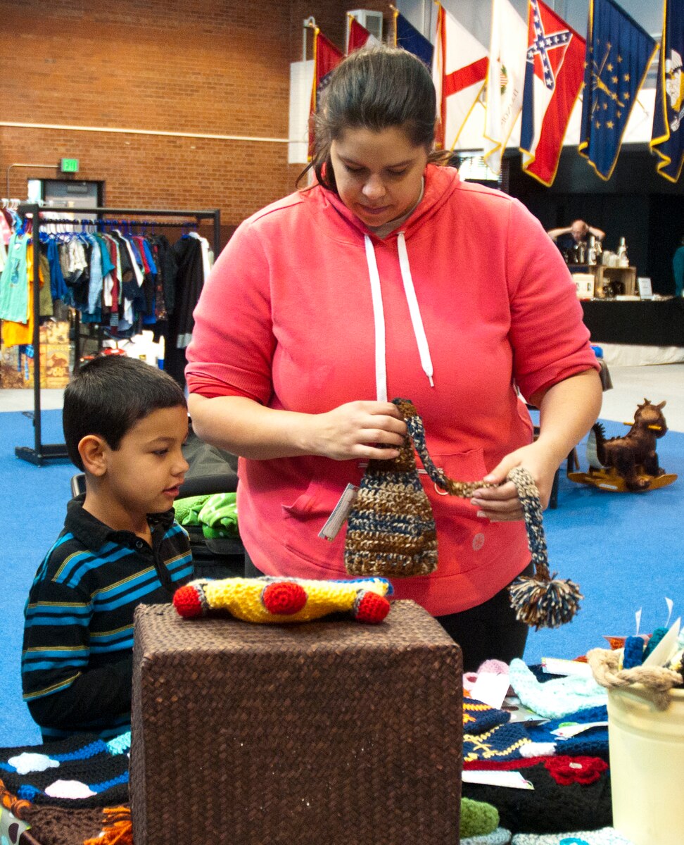 Jennifer Caldera and Carlos Caldera, Jr., wife and son of 1st Lt. Carlos Caldera, 90th Medical Operations Squadron, look over items at Natalie Moore’s stand, wife of Capt. Timothy Moore, 20th Air Force, at a flea market in the Fall Hall Community Center Aug. 30, 2014. Moore sold various hand-crafted items ranging from crockery hats to scarves. (U.S. Air Force photo by Airman Malcolm Mayfield)
