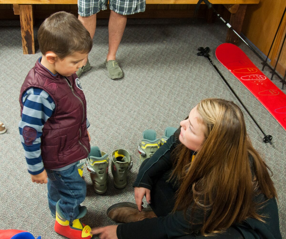 131108-F-GZ967-008 Kelly Palmer, Outdoor Recreation employee, helps Landon Lieber, 3, son of Master Sgt. Gabriel Lieber, 90th Missile Wing Command Post, as he tries on a pair of ski boots during Outdoor Recreation’s “Get Your Gear on” event Nov. 8. The event was designed to allow Airmen and their families to get their sizes for boots, skis, snowboards, and helmets fitted before the beginning of the winter season, allowing for a quick pick-up during the season. (U.S. photo by Airman 1st Class Brandon Valle)