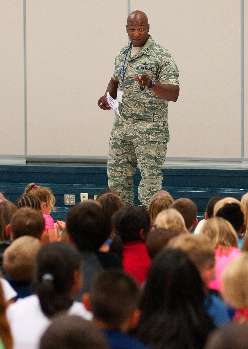 Col. Carl Jones, 90th Missile Wing vice commander, talks to Freedom Elementary School students outside F.E. Warren Air Force Base during an anti-bullying assembly Sept. 3, 2013. (U.S. Air Force photo by R.J. Oriez)