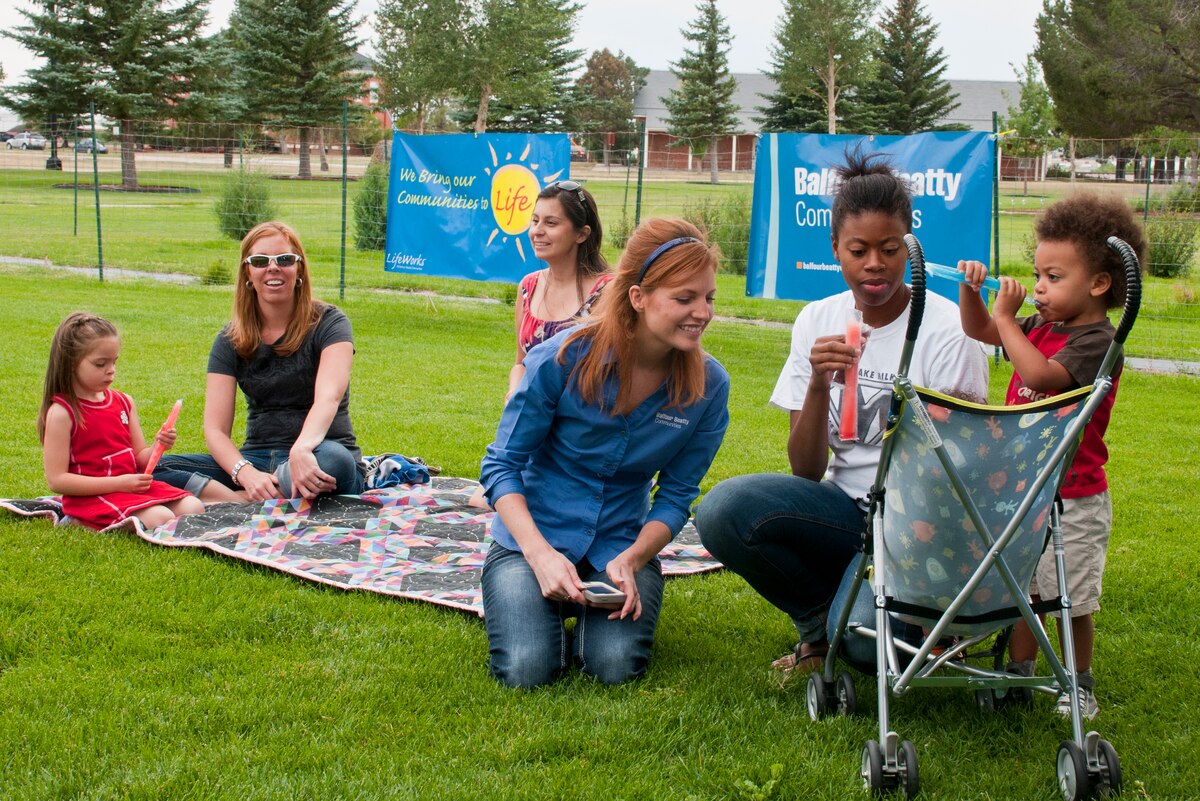 130809-F-BR137-006 F.E. Warren families and Balfour Beatty Communities staff gather near the playground between Quarters 2 and 7 Aug. 9, 2013, for one of BBC’s “Fun in the Sun” days, a family-focused “Lifeworks” gathering for BBC residents. BBC’s next Lifeworks event is a back-to-school clothing swap scheduled for Aug. 20 in the Fall Hall Community Center. To participate in the swap, people must RSVP by Aug. 19 by calling 514-5000. (U.S. Air Force photo by Airman 1st Class Jason Wiese)