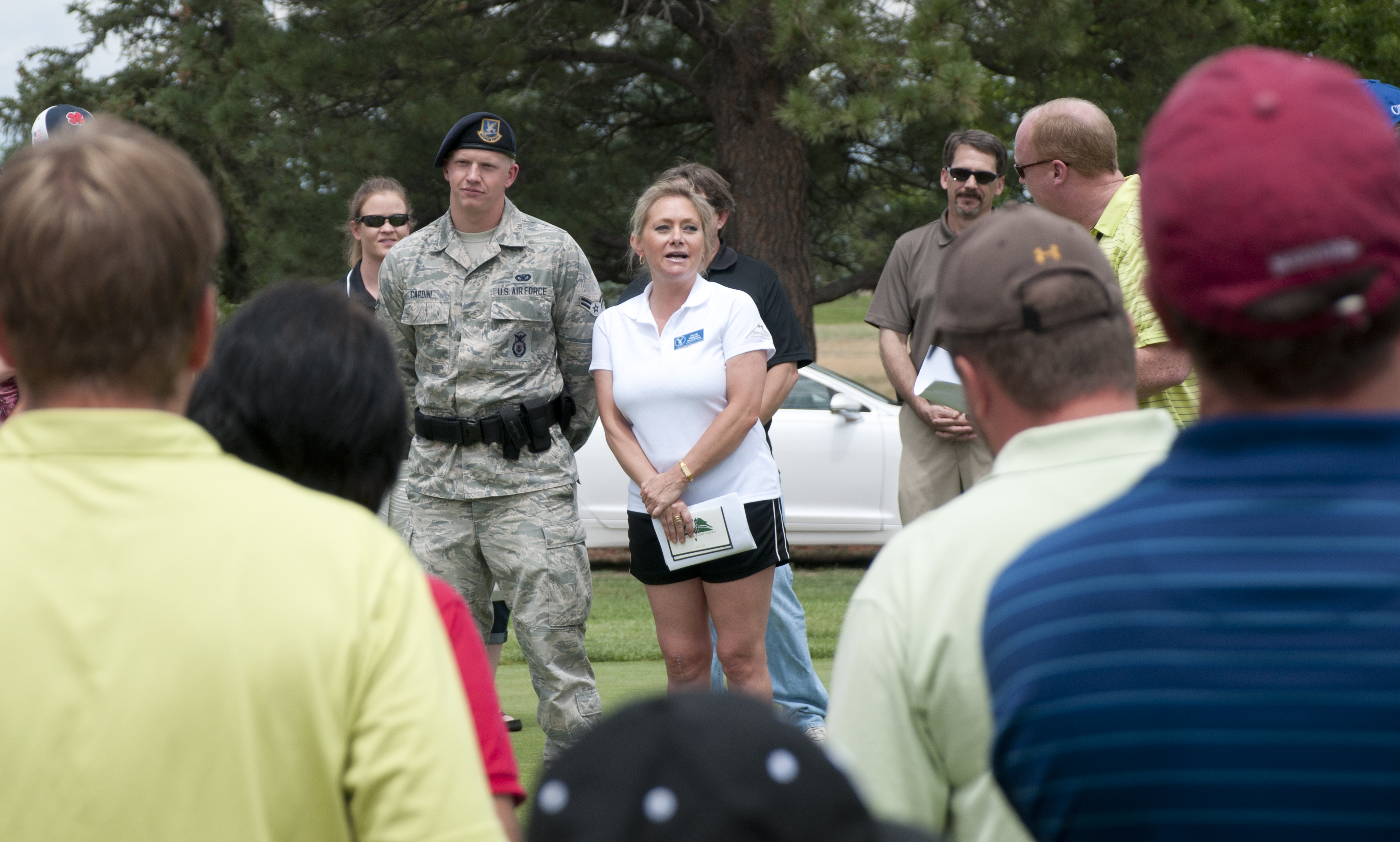 Nicole Whitaker, 2013 Military Affairs Committee Golf Scrambler Tournament co-chair, explains the rules of the tournament to participating teams July 12, 2013, outside the clubhouse on the F. E. Warren Golf Course. Different holes had special rules. For instance, on Hole 13, golfers wore an eye patch like the Jolly Roger emblem, and on Hole 11, team members were handcuffed together when putting. (U.S. Air Force photo by Airman 1st Class Jason Wiese)