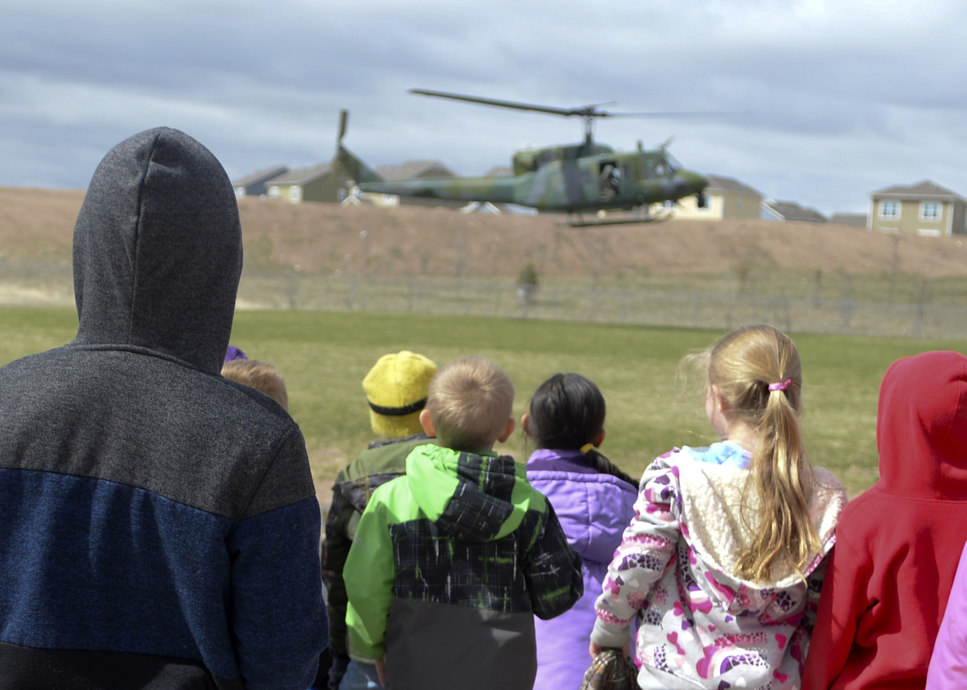 37th HS brings excitement to Freedom Elementary Published April 21, 2016 By Airman 1st Class Malcolm Mayfield 90th Missile Wing Public Affairs F.E. WARREN AIR FORCE BASE, Wyo. -- Airmen from the 37th Helicopter Squadron showed up in style—in a UH-1N Bell Helicopter, at the Freedom Elementary School April 21. April is the Month of the Military Child and the aircrew’s mission was to bring joy to the dozens of children. The students watched on as the crew landed the helicopter at the school in a grass field. Once landed, the crew showed the students the interior of the Huey and answered any questions they had. The base and school faculty worked together to show the military children at the school how important they are to the military members working in the Cheyenne area. “A lot of the kids were full of excitement and you could see it on their face as the Huey flew by,” Chad Delbridge, Freedom Elementary School principal. “We wanted to show them that they are special.”
