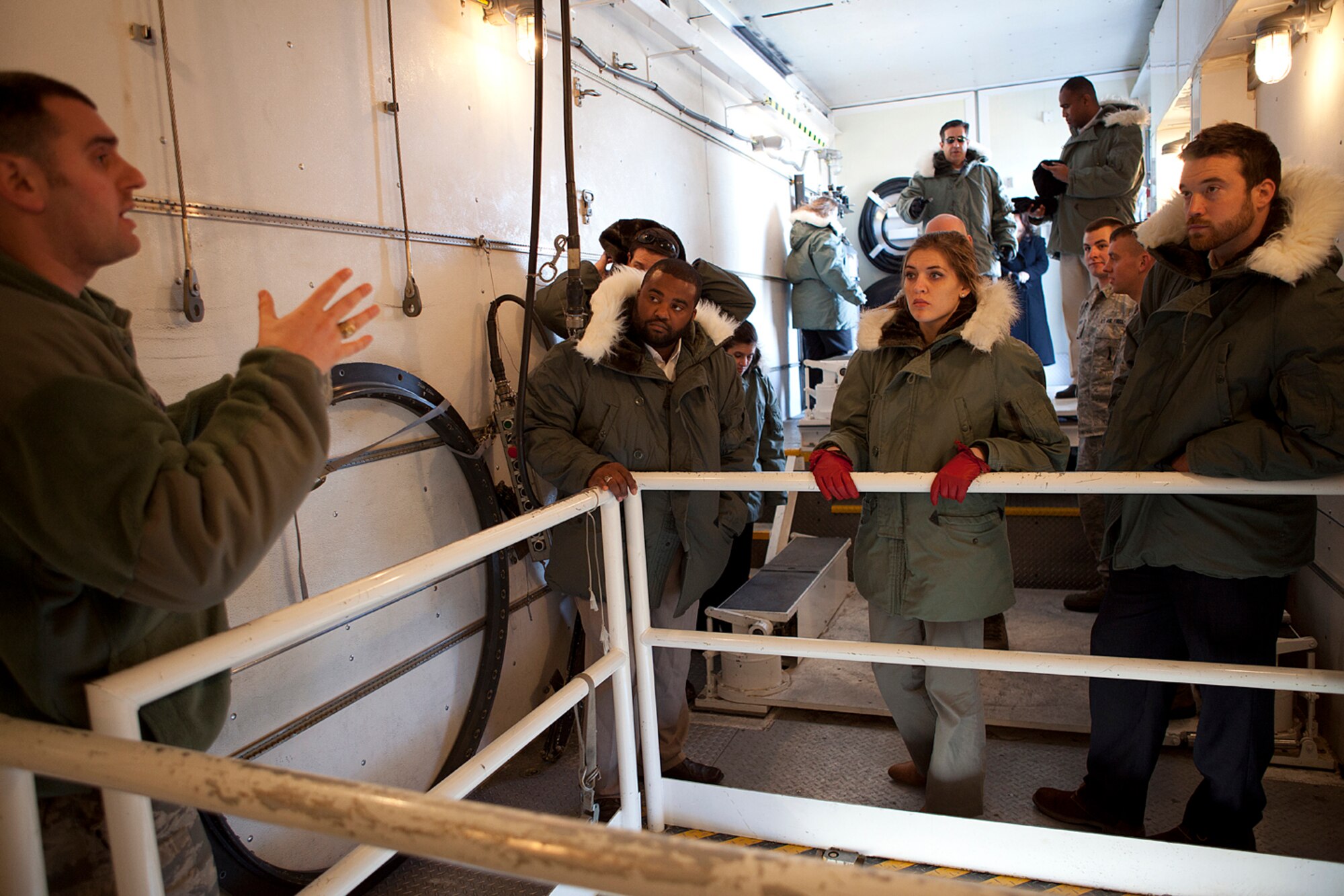 Maj. Gen. C. Donald Alston, 20th Air Force commander, Col. George Farfour, 90th Missile Wing vice commander, and Chief Master Sgt. David Nordel, 20th AF command chief, pose for a group photograph with Joseph Jones, military legislative assistant; Sen. Tom Harkin (D-IA); Wendy Gnehm, military legislative assistant; Sen. Mike Enzi (R-WY); Sierra Forbes, military legislative assistant; Sen. Mike Crapo (R-ID); Josh Hodges, military legislative assistant; Sen. David Vitter (R-LA); Landon Stropko, military legislative assistant, Rep. Cynthia Lummis (R-WY) as part of the staff delegation visit Feb. 23, at 20th AF Headquarters. (U.S. Air Force photo by Matt Bilden