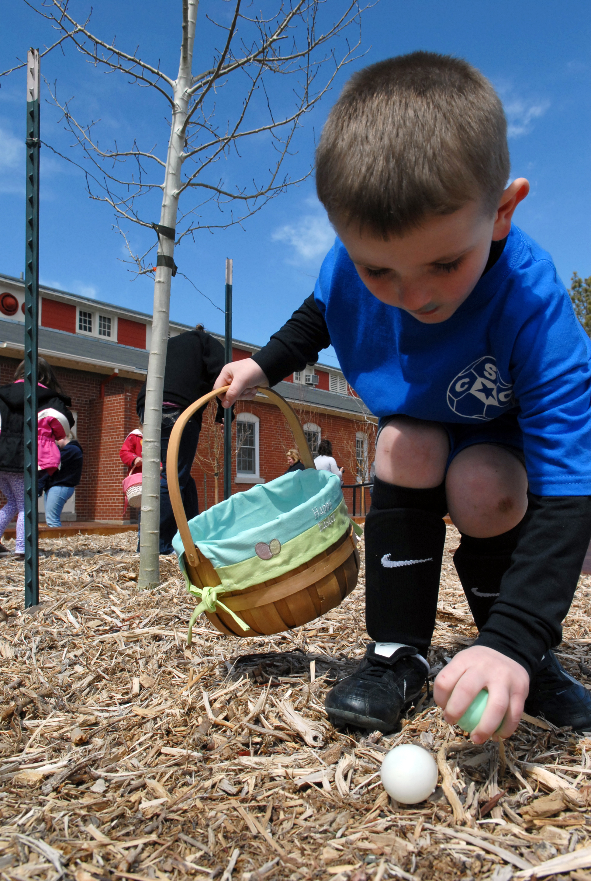 Trevor Csizmar, 4, gathers eggs at the 90th Civil Engineer Squadron’s family Easter party at fire station 1, April 16. Csizmar is the son of Tech. Sgt. David Csizmar, 90th CES, and his wife Brandy. An estimated 40 children and their parents attended the party. F. E. Warren’s Easter egg hunt is scheduled for Saturday morning, at the Fall Hall Community Center. Infants are scheduled to start their hunt at 10:05 a.m., 1 to 3 year-olds at 10:20 a.m., 4 to 7 year olds at 10:40 a.m. and 8 to 12 year-olds at 11:15 a.m. (U.S. Air Force photo by R.J. Oriez)
