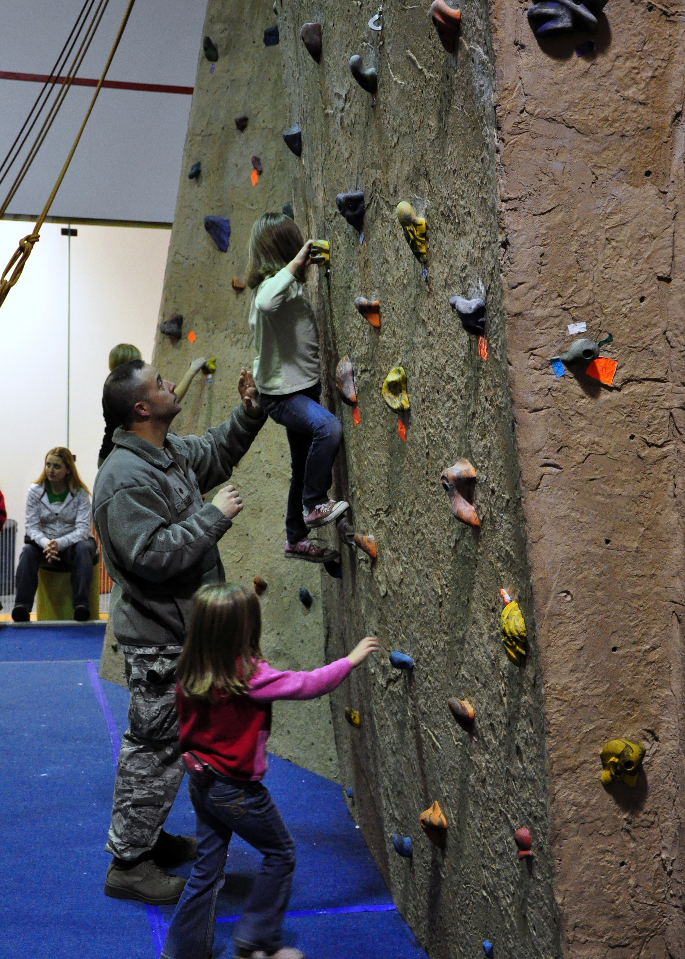 Major Allan Brock, 90th Missile Wing Judge Advocate, helps his daughters, Anna and Ava to navigate the climbing wall in the Fall Hall Community Center during the holiday season celebrations at Warren on Dec. 3. (U.S. Air Force photo by Staff Sgt. Chad Thompson)