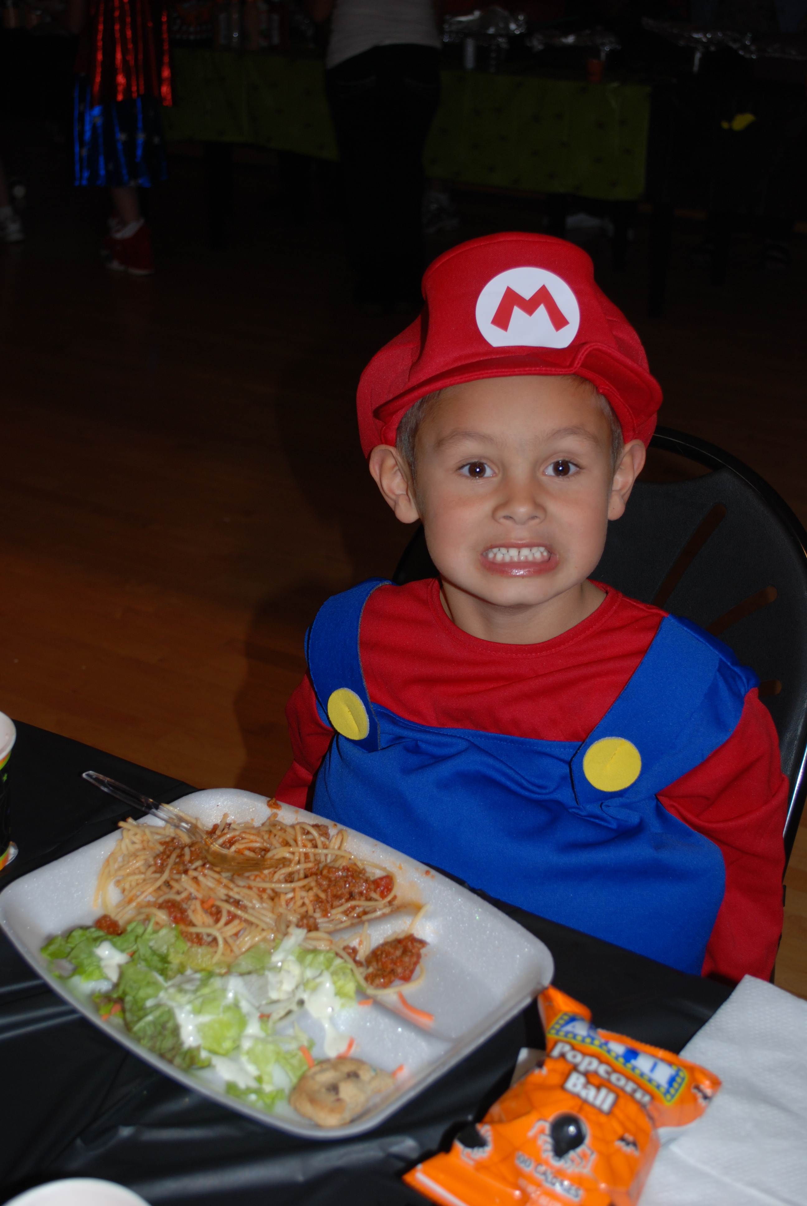 Sam Lavallie, son of Staff Sgt. Tracey Lavallie, 90th Missile Maintenance Squadron, enjoys a spaghetti dinner at the Fall Hall Community Center's Phantomous Spaghetti Dinner on Oct. 30. (U.S. Air Force photo by Lauren Redwine)
