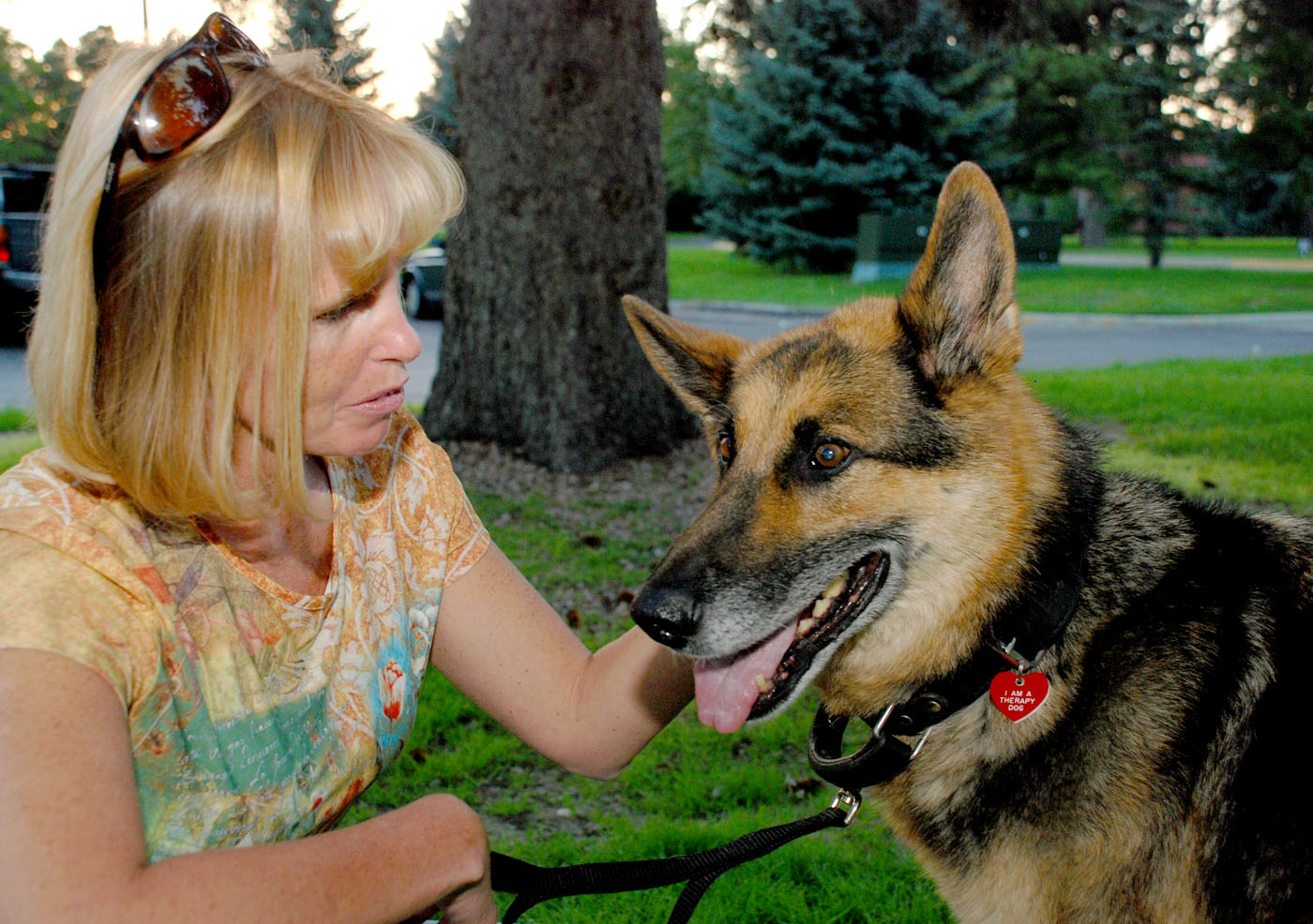 Capt. Jutta Cortes, 90th Space Wing Plans and Programs, and Castor, a retired military working dog, visited the Veteran’s Affairs Medical Center Aug. 21. Captain Cortes has been a part of Therapy Dogs Inc. since July (Photo by Airman 1st Class Daryl Knee).