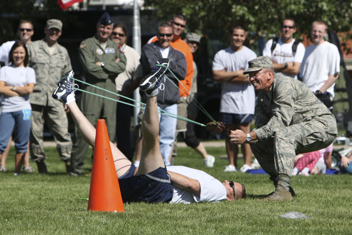 Master Sgt. Brian Bock, 90th Logistics Readiness Squadron, and Lt. Col. Gerald Clouse, 90th LRS commander, prepare to launch a buffalo chip. (Photo by Bernie Ernst)